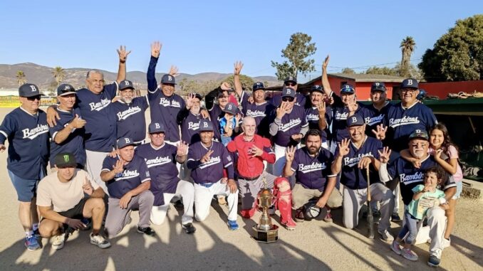 ENSENADA.- Bambinos se quedó con el trofeo de campeón de la categoría de 60 Años de la Liga de beisbol de Veteranos y Superveteranos de Ensenada, venciendo en el último juego de la serie final 12 carreras por 6 al Transportes Luna, juego que se fue hasta la novena entrada.